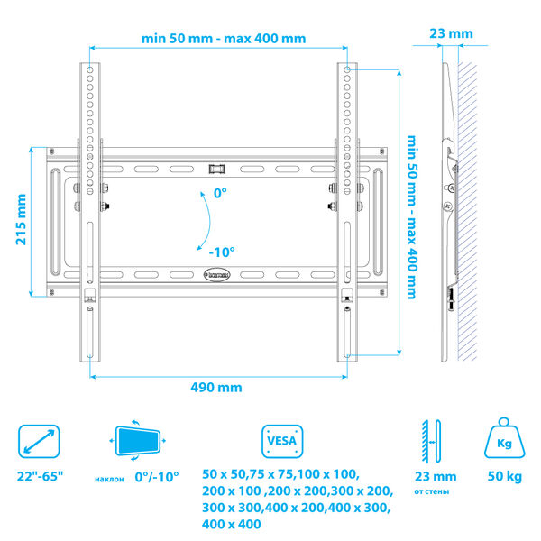 Надежная стальная конструкция максимальная нагрузка до 50 кг, Минимальное расстояние до стены 23 мм, Простой и легкий монтаж, Универсальная система крепления, Защита от падения |